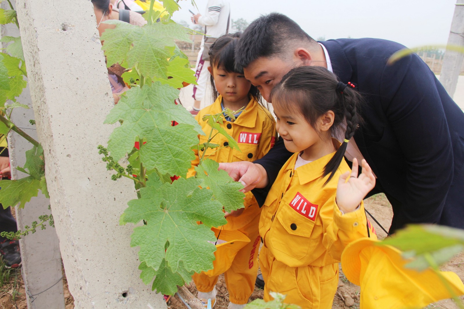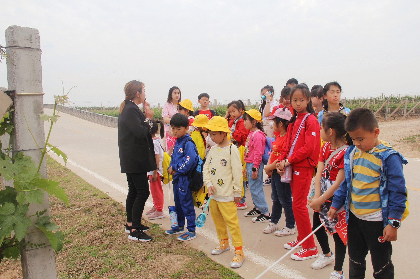 在前往格瑞特酒莊綜合大樓的路途中,同學(xué)們背著小書包、拎著小水壺,臉上洋溢著笑容,興高采烈地穿梭于葡萄園中,講解員也為同學(xué)們講解了關(guān)于園區(qū)種植規(guī)模、釀酒葡萄品種等的知識(shí),大家充滿好奇站在田間觀察著每個(gè)葡萄的小果實(shí),親身的去感受大自然的神奇。
