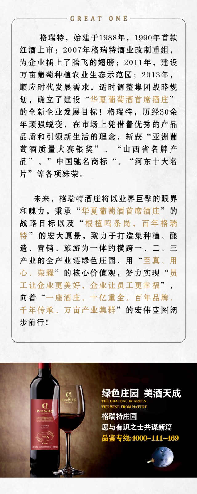 山西格瑞特酒莊有限公司成立于上世紀80年代,是一家集釀酒葡萄種植,釀酒生產,農業(yè)產業(yè)化,工業(yè)旅游化為一體